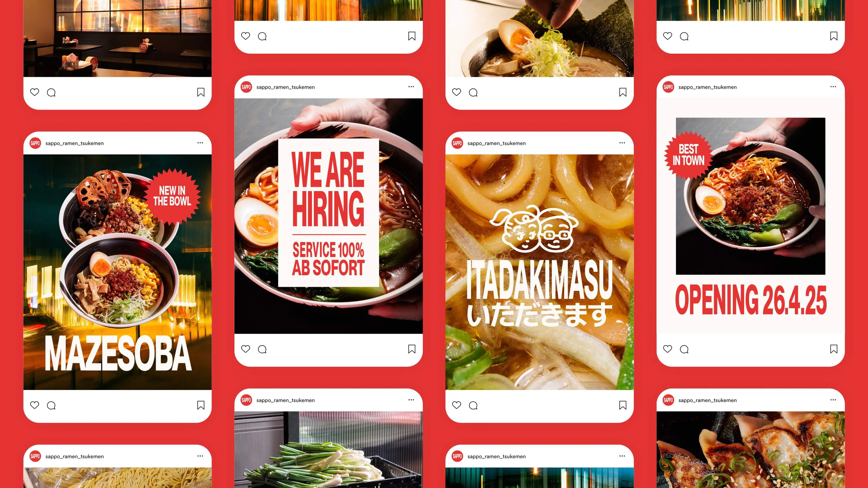 SAPPO Ramen brings Sapporo-style ramen to Zurich. At allink, I was involved in developing the branding for the new restaurant in Kreis 5. The goal was to create a distinctive, urban identity with high recognition value. The design picks up on visual codes from Japanese ramen bars and translates them into a striking, contemporary brand world. Bold typography, strong color contrasts, and a visual language inspired by the vibe of Southeast Asian cities ensure a consistent appearance across all touchpoints.
